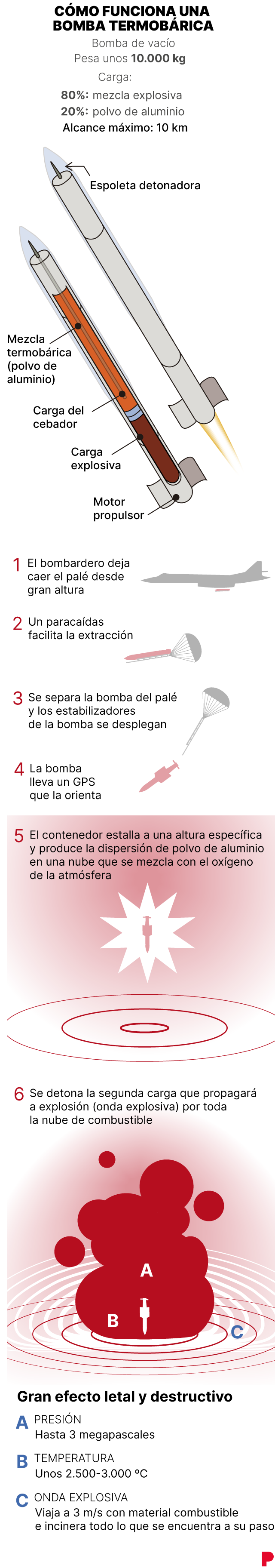 Según expertos militares citados, las armas termobáricas, elaboradas con composiciones químicas específicas, a parte de matar, destruyen la materia, convirtiendo cuerpos humanos en cenizas en segundos. "A diferencia de los explosivos convencionales, estas armas dispersan una nube de combustible que, al encenderse, crea una enorme bola de fuego y un efecto de vacío", explica Vasili Fatigarov, experto militar ruso. "Para prolongar el tiempo de combustión, se añaden polvos de aluminio, magnesio y titanio a la mezcla química. Esto eleva la temperatura de la explosión a entre 2.500 y 3.000 grados Celsius", añade. El intenso calor suele ser generado por tritonal, una mezcla de TNT y polvo de aluminio utilizada en bombas fabricadas en suelo estadounidense como la MK-84. Al caer, estas bombas, de casi 1.000 kilos de peso, pueden provocar daños en un radio de 300 metros.